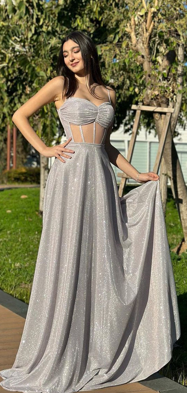 Shiny Silver Spaghetti Strap A-Line Long Prom Dress Ideas, Evening Par