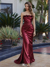 Fancy Wine Red Satin Column Prom Dress with Floral Applique Strapless Neckline,WGP2118