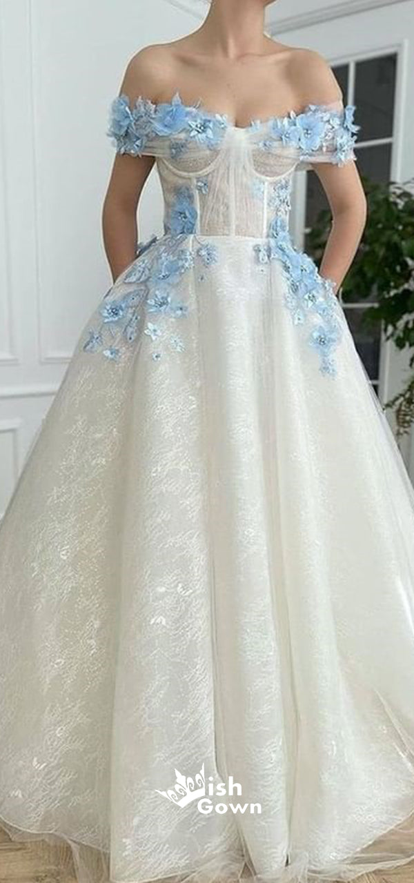 Off Shoulder Blue Handmade Flowers A-line Evening Gowns Prom Dresses, WGP226