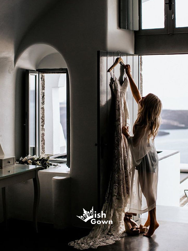 Floral Lace Beach Wedding Dresses Cathedral Train Rustic Bridal Dresses Wedding Dresses, WGB007