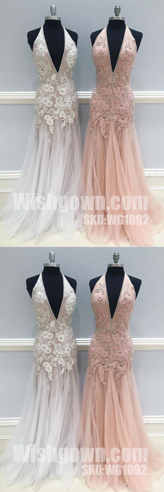 Charming Applique Tulle Hater Mermaid Deep V Neck Long Prom Dresses, WG1092