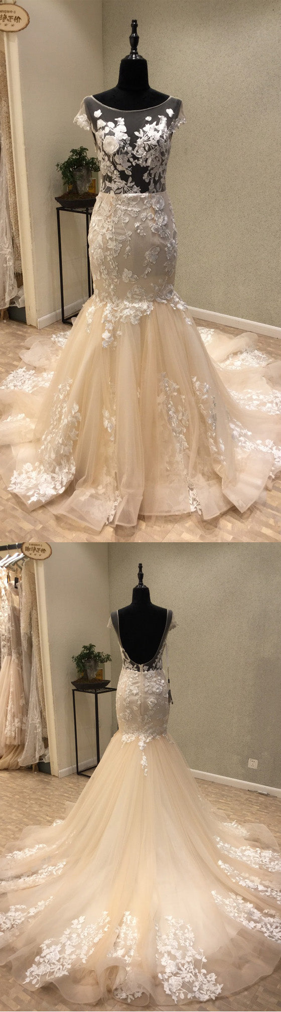 Cap Sleeves Mermaid Backless Sexy See Through Bridal Long Wedding Dresses, WG1242