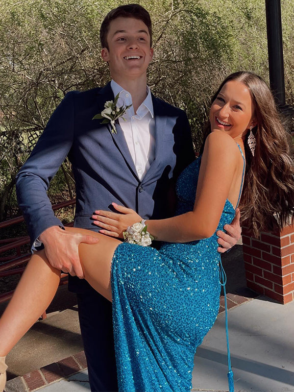 Elegant Blue Mermaid Spaghetti Strap Side Slit Popular Long Evening Dresses, Formal Dresses, Birthday Party, WGP606