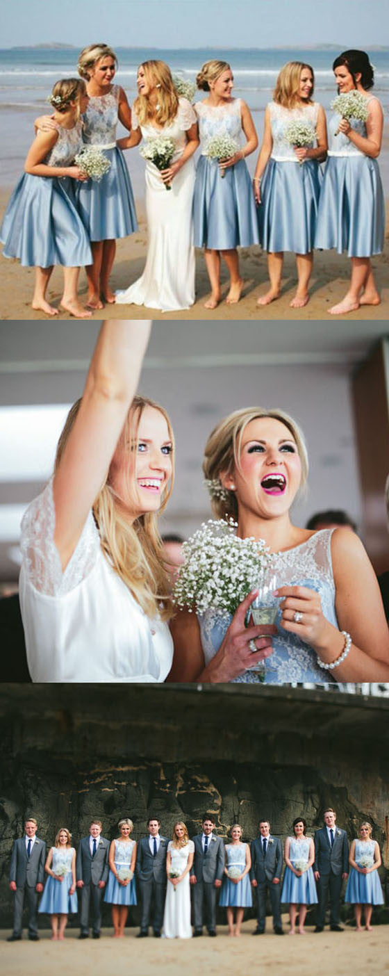 Popular Junior Pretty Blue Satin White Lace Short Bridesmaid Dresses for Summer Beach Wedding Party, WG181