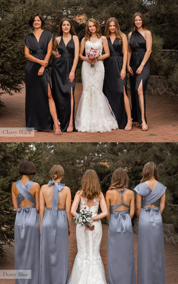 Different Colors Mismatched Satin Black Burgundy Dusty Pink Blue White Teal Green Side Split Long Sheath Bridesmaid Dress, WGM034