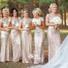 Poular Champagne Gold Sequins Cap Sleeves Backless Sheath Long Bridesmaid Dresses, WG04
