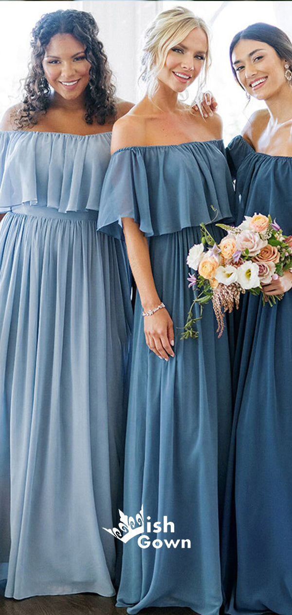 Different Blue Off Shoulder Chiffon A-line Wedding Guest Long Bridesmaid Dresses, WGM025