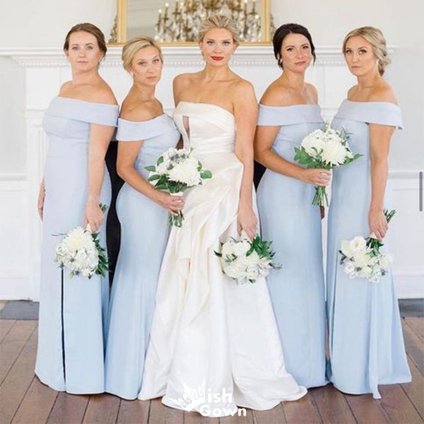 Elegant Blue A-Line Side Slit Off-Shoulder Sleeveless Wedding Guest Bridesmaid Dresses,WGM356