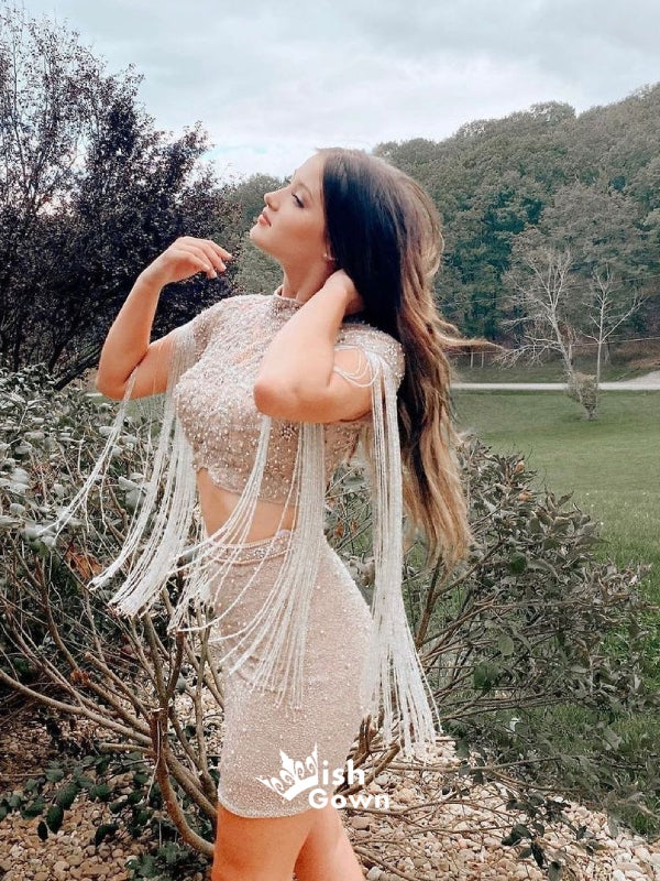 Sparkly Champagne Tassels Two Pieces Beads Lace Short Mermaid Party Dresses , WGP129