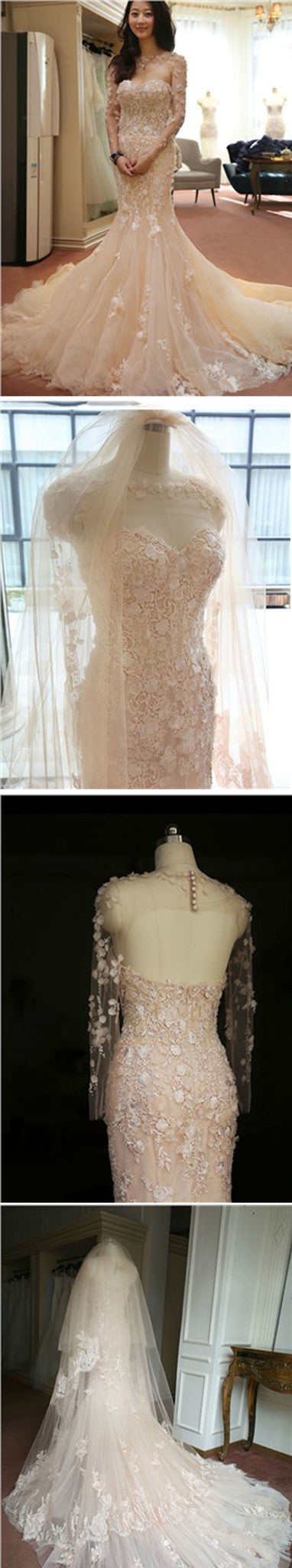 Stunning Pink Two Pieces Long Sleeve Sweetheart Mermaid Appliques Wedding Dresses, WD0160