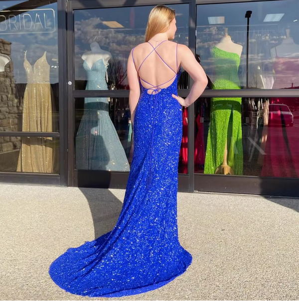 Shiny Blue Spaghetti Straps Lace up Mermaid Long Party Dress Prom Dresses,Evening Dress Online, WGP919
