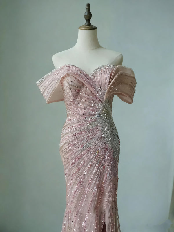 Sparkly Pink Off-Shoulder Mermaid Side Slit Long Prom Dress Ideas, Evening Party Dresses,WGP1753