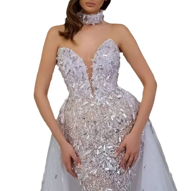 Stand up straight with shoes on and measure from the the center of the collarbone,down to where the hem of the dress shouldhit(excluding anytrain).