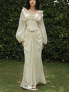 Unique Floral White V-Neck Long Sleeve Long Prom Dress Ideas, Evening Party Dresses,WGP1816