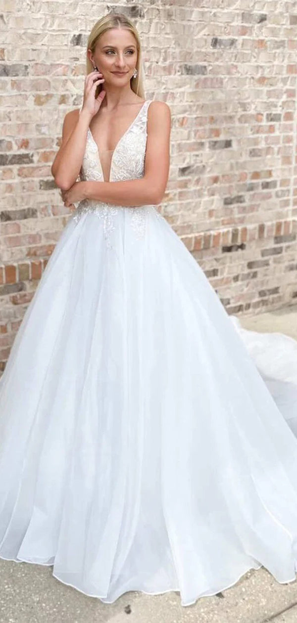 Romantic Spaghetti Straps V Neck Sleeveless With Trailing Applique Popular Bridal Long Wedding Dresses, WDH142