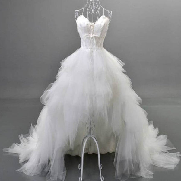 Unique Style Hi-low Sweetheart White Tulle Spaghetti Wedding Dresses With Feather, WD0067