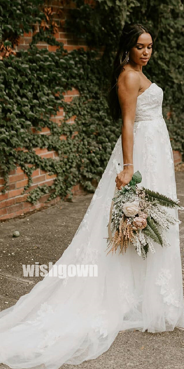 White Sweetheart Strapless Applique Tulle Long Wedding Dresses WDH007
